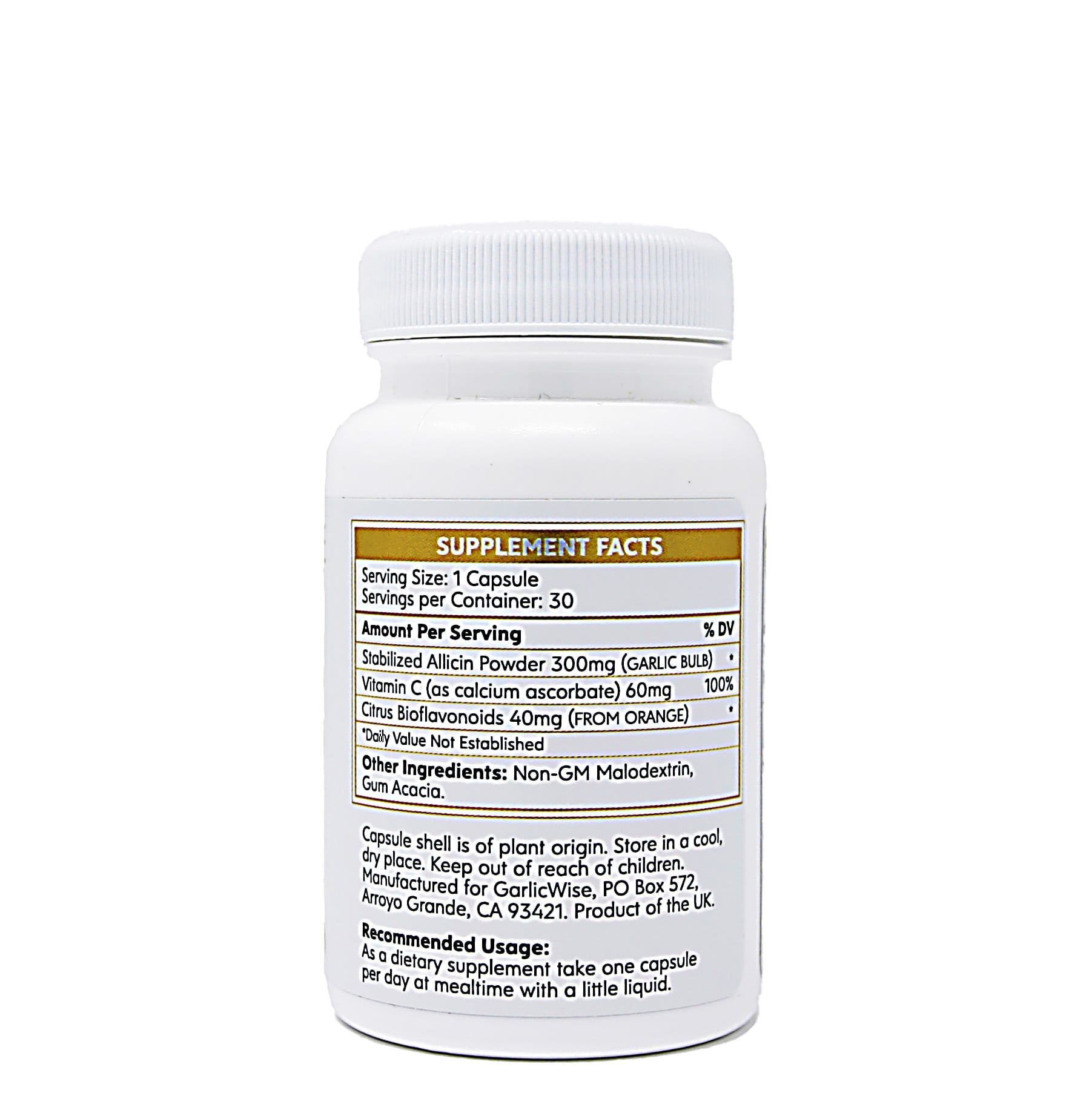 Ingredients: Allicin powder 300 mg, Vitamin C as Calcium Ascorbate 60 mg, Citrus Bioflavonoids 40 mg, non GM Maltodextrin, Gum Acacia, capsule is of plant origin.